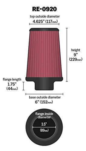 K&N RE-0920 Universal Clamp-On Air Filter: Round Tapered; 3.5 in (89 mm) Flange ID; 9 in (229 mm) Height; 6 in (152 mm) Base; 4.625 in (117 mm) Top
