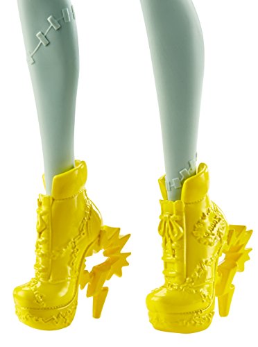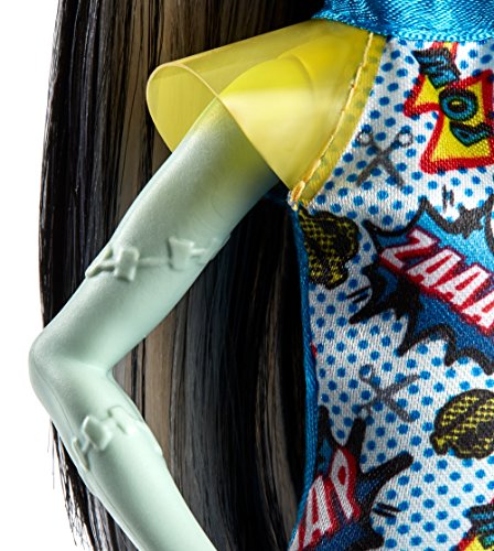 -. Binding : Toy -. Brand : Monster High -. EAN : 0887961537598 -. Feature : Have POW-erful fun with Frankie Stein doll wearing a dress with comic book inspiration / The daughter of Frankenstein is electric in a bright dress -- the colorful print says "zaaap" and "pow" and yellow acrylic shoulders add wow / Yellow shoes pack a punch with iconic lightning bolt-shaped heels and a pair of earrings shout "bam." / Monsterrific touches on the 12-inch doll include stitches, bolts and her signature black and white hair / Collect all of the Monster High dolls to build a world where Everyone Is Welcome (each sold separately, subject to availability) -. IsAdultProduct : 0 -. Label : Mattel -. Manufacturer : Mattel -. Model : FJJ15 -. MPN : FJJ15 -. NumberOfItems : 1 -. PackageQuantity : 1 -. PartNumber : FJJ15 -. ProductGroup : Toy -. ProductTypeName : TOYS_AND_GAMES -. Publisher : Mattel -. ReleaseDate : 2017-10-20 -. Studio : Mattel -. Title : Monster High Frankie Stein Doll -. UPC : 887961537598 -. Warranty : 1 year warranty against manufacturer defects