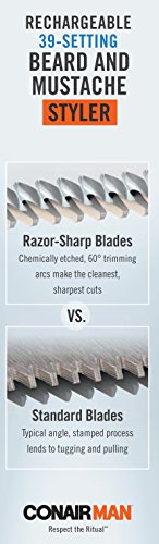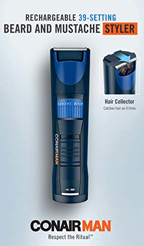 -. Binding : Health and Beauty -. Brand : Conair -. Color : Blue -. EAN : 0074108368072 -. Feature : The Conair Man Rechargeable Beard and Mustache Steeler / Trimmer is ideal for either stubble to long beard looks with 39 total trimming settings ranging from 1mm - 20mm / Razor-Sharp Blades are chemically etched, allowing for 60-degree trimming arcs which make the cleanest sharpest cuts vs. that of standard blades / The included Hair Collector at the base of the blade is a great way to keep your bathroom clean and free of those trimmed hairs / Includes: guide comb, styling shears, washable head / For Stubble to Long Beard Looks with 60-minute runtime -. Label : Conair -. Manufacturer : Conair -. MPN : BE15138466 -. NumberOfItems : 1 -. PackageQuantity : 1 -. PartNumber : BE15138466 -. ProductGroup : Beauty -. ProductTypeName : BEAUTY -. Publisher : Conair -. ReleaseDate : 2017-08-14 -. Studio : Conair -. Title : Conair Rechargeable Beard and Mustache Styler/Trimmer for Men, Blue -. UPC : 074108368072