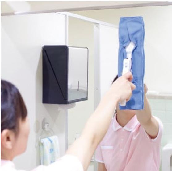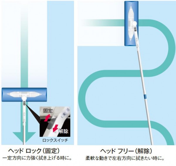 パウダールームやレストルームの鏡の拭き掃除に最適!!一定方向に力強く拭き上げる時に便利なヘッドロックと、柔軟な動きで左右方向に拭きたい時に使えるヘッドフリーを使い分けて快適にお掃除♪ |
