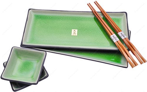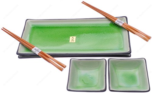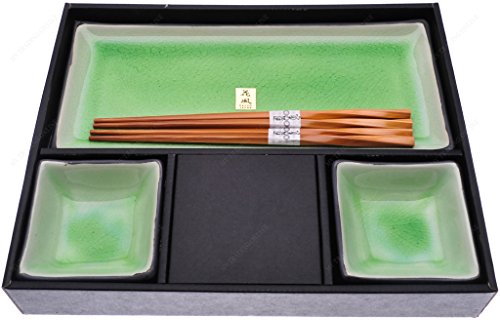 Studio : M.V. Trading Publisher : M.V. Trading Product Description This sushi for two set is named for its beautiful color that is reminiscent of a peaceful country lake. the unglazed border adds a rustic, handmade feeling to these-Pieces and creates a perfect contrast to the cool green glaze. 0