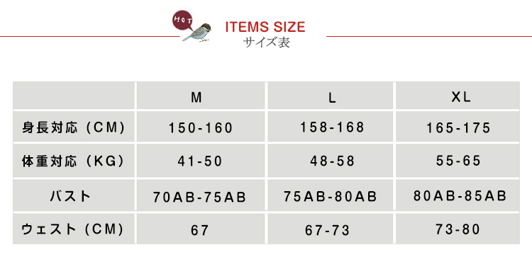 M 身長対応 150-160cm 体重対応41-50kg バスト70AB-75AB ウェスト67cmL 身長対応 158-168cm 体重対応48-58kg バスト75AB-80AB ウェスト67-73cmXL 身長対応 165-175cm 体重対応55-65kg バスト80AB-85AB ウェスト73-80cm