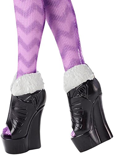 -. Feature : Kitty Cheshire, daughter of the Cheshire Cat of Wonderland, has decided to rewrite her destiny as an Ever After Rebel / The posable doll wears her iconic outfit from the webisodes / Her outfit has cat-inspired P.R.Int, purple patterned tights, "fur"-lined booties, yarn-themed jewelry / Comes with a headband and bag with grinning face are the cat's meow / Doll also comes with a doll stand, doll hairbrush and bookmark that reveals her hexclusive story