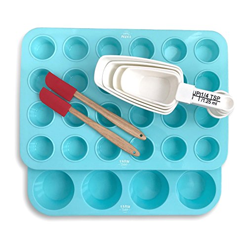 - COMPLETE BAKING SET - Our set includes one regular-sized 12-cup muffin pan and one 24-cup mini-muffin pan. We've included two essential accessories in our set: a full set of measuring spoons/cups and two tiny spatulas. Mini-muffin cups use 1 Tablespoon of batter while regular-sized muffin cups use 3-4 Tablespoons (or 1/4 cup). Our measuring tools and tiny spatulas will help you distribute batter evenly, without making a mess, for great results!