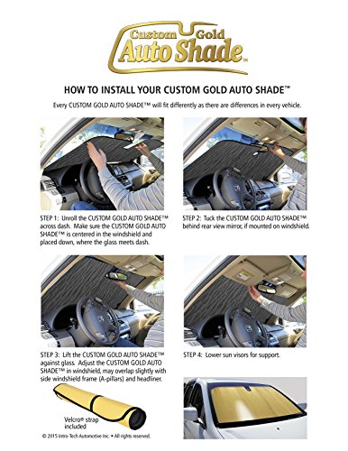 The Intro-Tech Automotive Custom Auto Shade is manufactured using a superior quality multi-layered material with a metalized outer film that reflects harming UV rays. Computer precision cut for a custom fit, it reduces inside temperatures up to 40 degrees Fahrenheit. It protects leather seats from becoming hot and cracking while keeping the steering wheel and shift knob comfortable to the touch. Beautifully finished with a UV resistant, non-abrasive velour binding; it is easy to roll up and an attached Velcro strap makes stowing a breeze. Lifetime warranted, and designed to perform, this interior saving accessory is a must have for all owners concerned with lowering temperatures inside their parked vehicle. Available in over 2,000 custom fit windshield applications for cars, trucks, SUV's and minivans.Feature