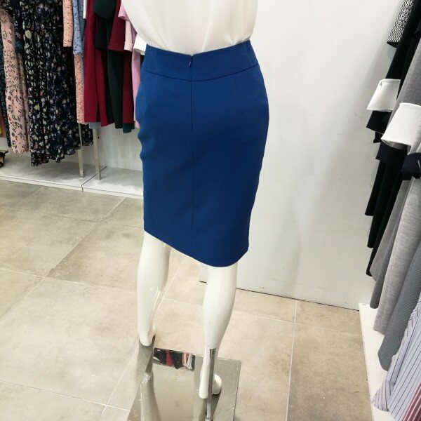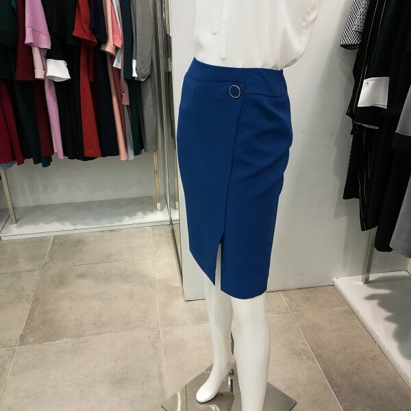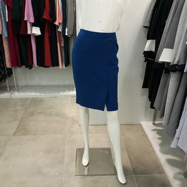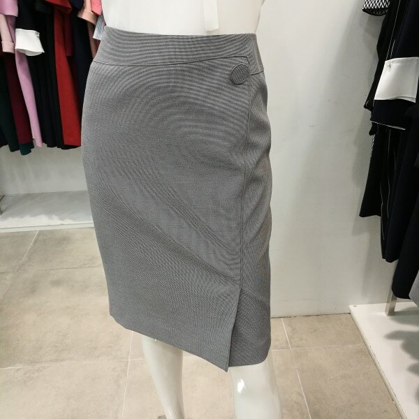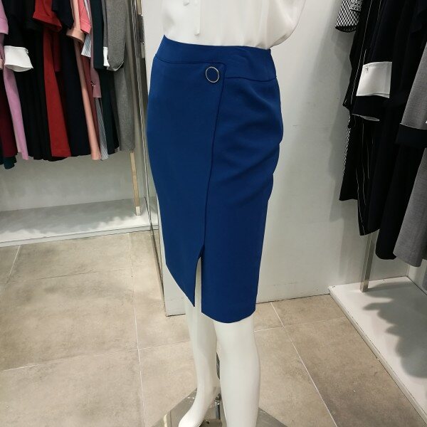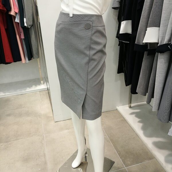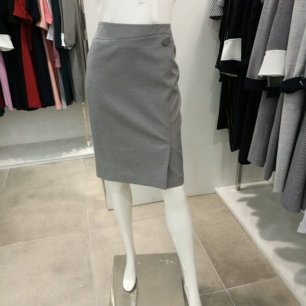 앞트임이며 파이핑처리 되있고 단추장식이 포인트로 아주 세련된H라인의 스커트임.