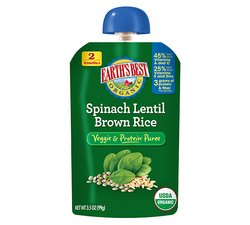 Earths Best Organic Peas Spinach Lentil Brown Rice Veggie Protein Infant Puree Pouch, 3.5 Ounce -- 12 per case. USDA Organic Certified Non-GMO 2-3g of Protein 25 Percent Daily Vitamin E and Zinc 45 Percent Daily Value of Vitamin A
