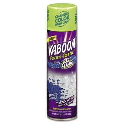 -. Feature : Qty is 1pk, of Kaboom Foam-Tastic with Oxi-clean Fresh Scent, 19 Ounce / Removes Soap scum, dirt, hard water stains, calcium , lime, grease and grime. Use on Tubs, glazed ceramic tile, fiberglass, shower doors and vinyl curtains, sinks, countertops and chrome fixtures / Do not use on acrylic, brass or unsealed granite or marble. Non staining formula / Changes color when clean: Sprays on blue, when the foam turns white just wipe and rinse to reveal a brilliant shine. / Takes the guesswork out of cleaning