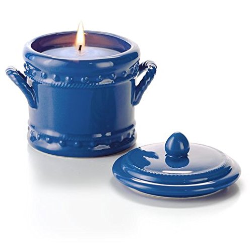 - Scented candle in a decorative ceramic crock with ceramic lid.