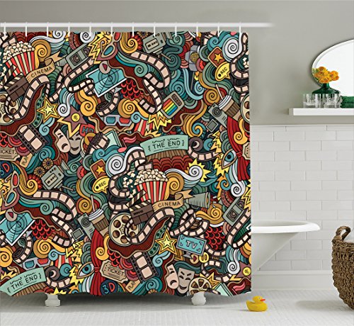 Doodle Shower Curtain by Ambesonne, Cinema Items Combined in an Abstract Style Popcorn Movie Reel The End Theatre Masks, Fabric Bathroom Decor Set with Hooks, 70 Inches, Multicolor