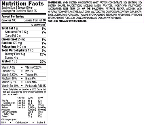 - Feature : A 100-calorie serving helps you meet lean body goals and helps manage hunger / 15g of protein from fast-digesting whey and slow-digesting micellar casein deliver a steady supply of amino acids to your muscles / 5g of dietary fiber-including 1.2g prebiotics-promote digestive health / Antioxidant vitamins C & E and selenium for immune support / Convenient design with scoop holder in lid