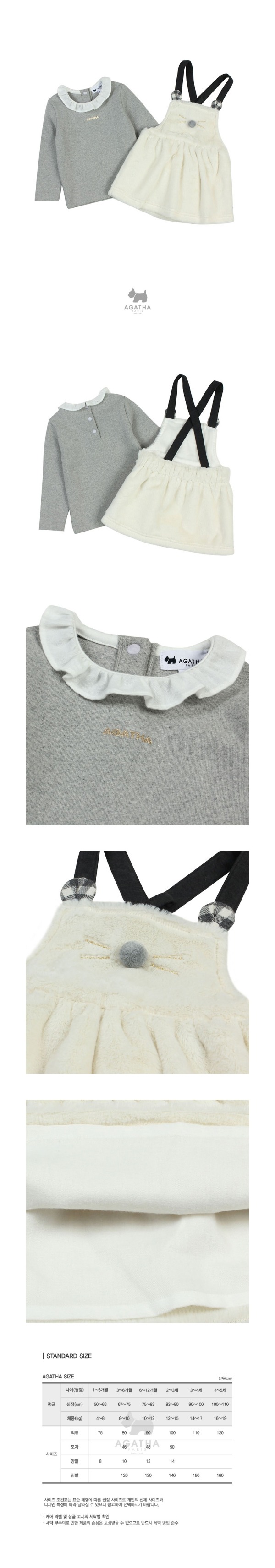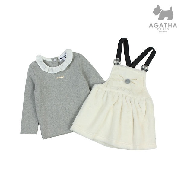 체크 귀장식과 폼폼장식이 포인트가 되는 퍼 멜빵 스커트와 기본 플레어 카라 셔츠가 세트로 구성된 상하복입니다.