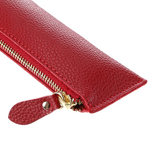 BTSKY Genuine Leather Pencil Case - Zippered Pen Case Stationery Bag Zipper Pouch Pencil Holder (Red)