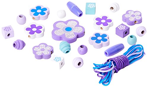 Make three glittering necklaces with this pretty wooden bead set! A collection of over 45 wooden beads includes cubes, rounds, barrels, and giant flowers with glittering foil accents, all in pretty shades of purple, yellow, and green. The three woven laces, capped with sturdy aglets, thread easily through the wooden beads to make jewelry-making a snap! Kids simply lace the beads, knot to attach the clasp, and wear their hand-made accessories with pride. Laces and beads store in a handy wooden tray that’s perfect for containing supplies and preventing rollaway beads.Feature