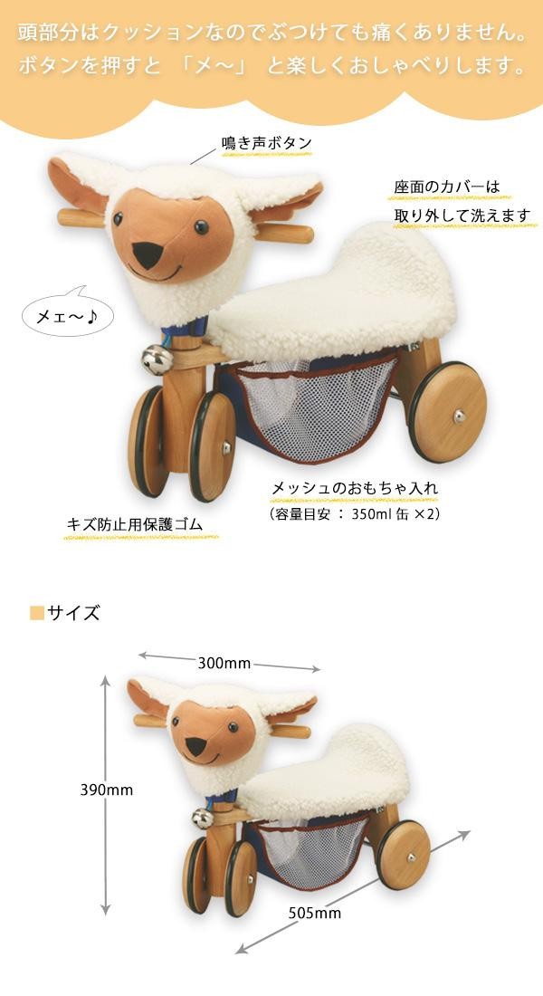 | 頭の部分はクッションなのでぶつけても痛くありません。座面のカバーは取り外して洗えます。木製キャスターは可愛いだけでなく、床面のキズ防止用に保護ゴムが取り付けられています。ボタンを押すと「メ~♪メ~♪」と楽しく鳴きます。電池は交換可能です。 |