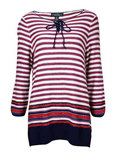 LRL Lauren Jeans Co. Women's Striped French Terry Laced-Up Sweater