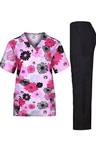 MedPro Women's Medical Scrub Set Printed V-Neck Top and Cargo Pants  Black Pink Floral L