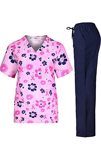 MedPro Women's Medical Scrub Set with Printed V-Neck Top and Cargo Pants Pink Navy L