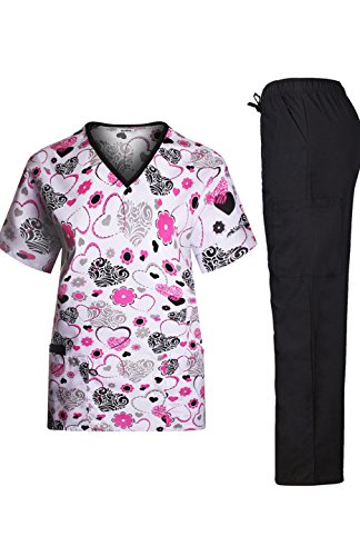 MedPro Women's Medical Scrub Set with Printed V-Neck Top and Cargo Pants  Pink Black 1XL (9004A-84)