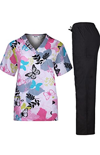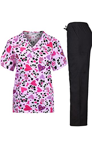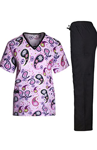 MedPro Women's Medical Scrub Set with Printed V-Neck Top and Cargo Pants Pink Black M