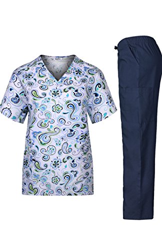 MedPro Women's Medical Scrub Set Printed V-Neck Top and Cargo Pants  Navy Paisley L