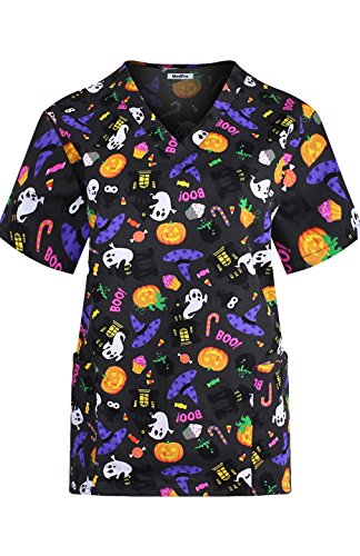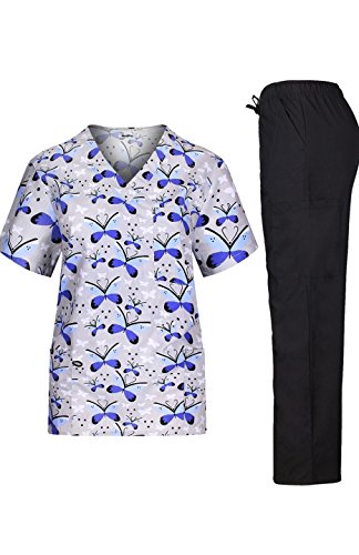 MedPro Women's Medical Scrub Set with Printed V-Neck Top and Cargo Pants Black Blue XL