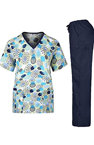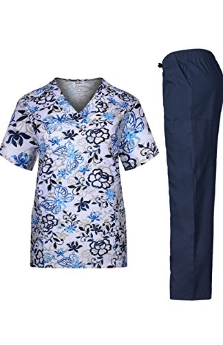 MedPro Women's Medical Scrub Set Printed V-Neck Top and Cargo Pants  Navy Blue XL