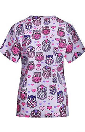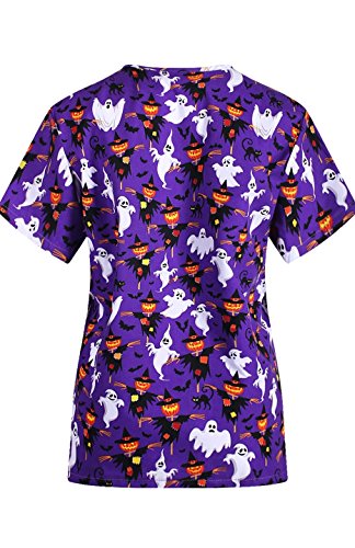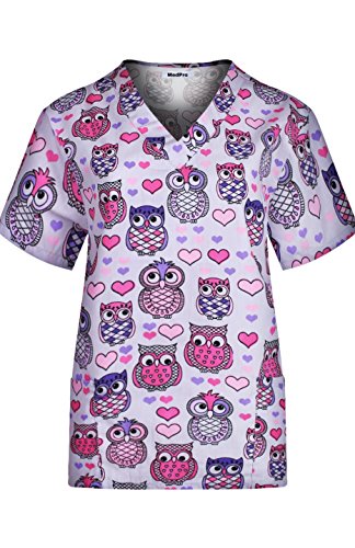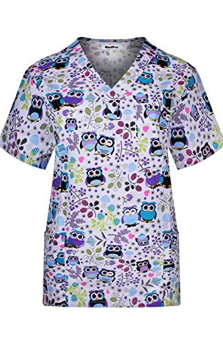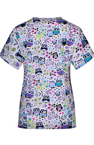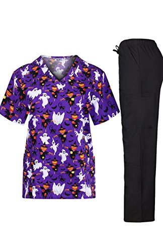 MedPro Women's Medical Scrub Set with Printed V-Neck Top and Cargo Pants White Purple L