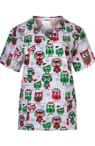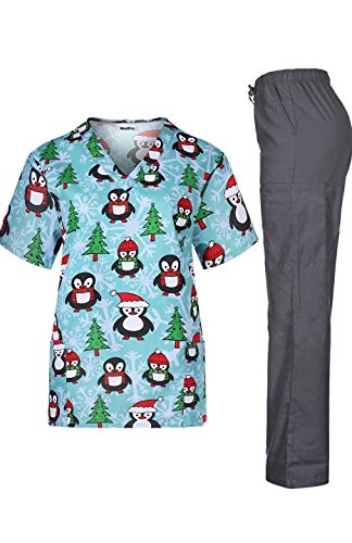MedPro Women's Medical Scrub Set with Christmas V-Neck Top and Cargo Pants Grey M