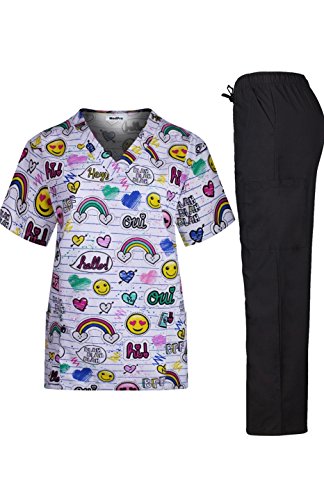 MedPro Women's Medical Scrub Set with Printed V-Neck Top and Cargo Pants White Black L
