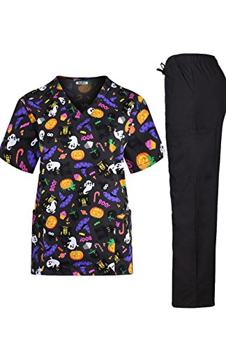 MedPro Women's Medical Scrub Set with Printed V-Neck Top and Cargo Pants White Black M