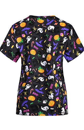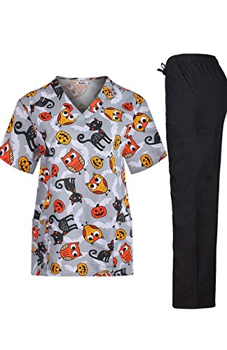 MedPro Women's Medical Scrub Set with Printed V-Neck Top and Cargo Pants White Black XL
