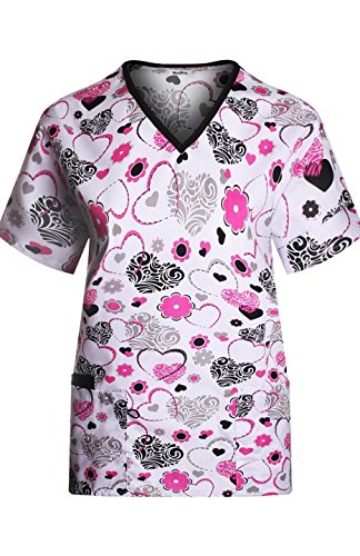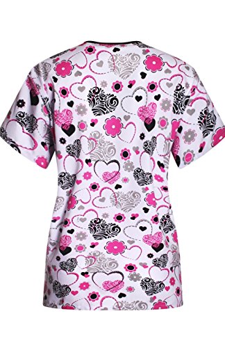 MedPro Women's Medical Scrub Set V-Neck Print Top and Cargo Pants White Pink Hearts M