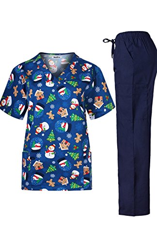 MedPro Women's Medical Scrub Set with Christmas Print V-Neck Top and Cargo Pants Navy XL