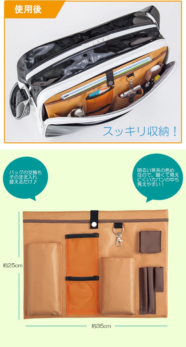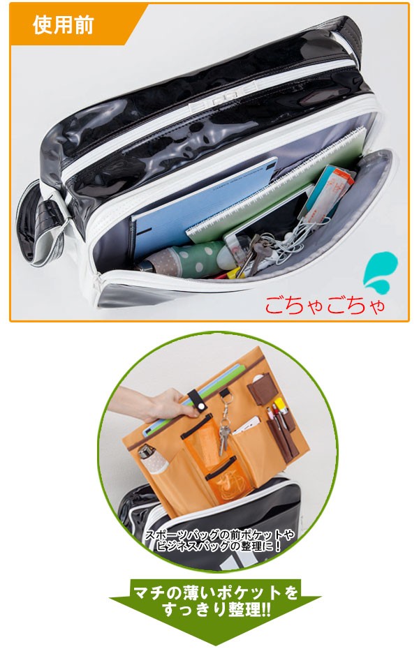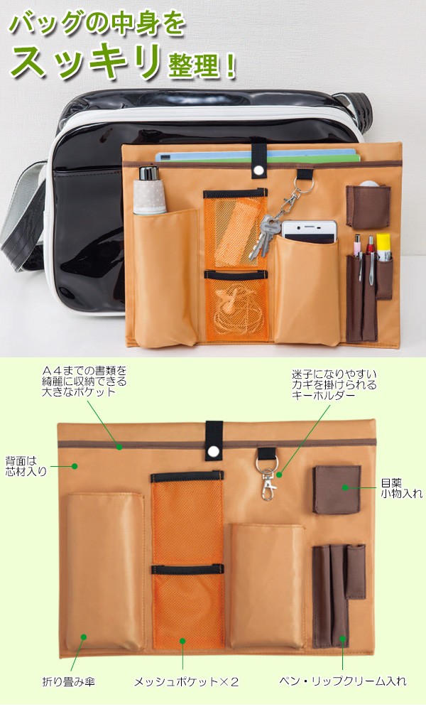 | <h1>スポーツバッグの前ポケットやビジネスバッグのポケット等、マチの薄くてデッドスペースになっているポケットをすっきり活用するアイテムです。傘・携帯・イヤホン・ペン・小物など、様々なアイテムを定位置に収納できるので探す手間も省けます。A4サイズの書類が入る大きなポケット・鍵用のナスカンキーホルダー付き。 バッグインバッグ/収納/整理用品/薄い/薄型/手提げかばん/便利グッズ/仕切りポケット</h1> |