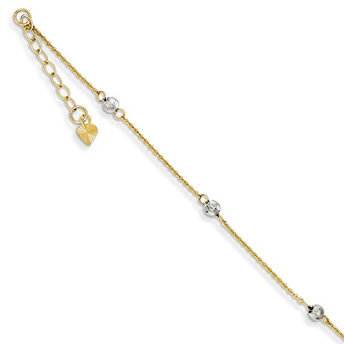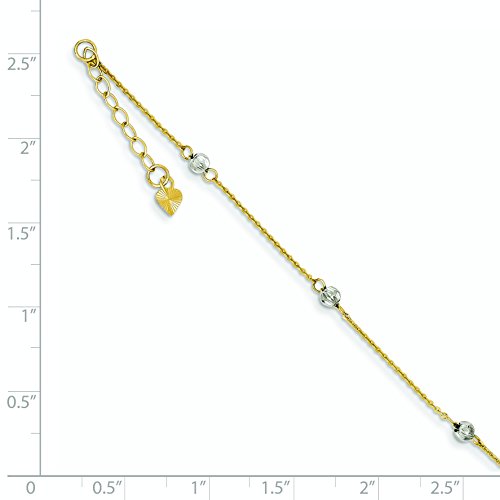 SPECIFICATIONS: Jewelry Type: Anklets, Anklet Type: Anklets with Stations, Material: Primary: Gold, Material: Primary - Color: Two-Tone, Material: Primary - Purity: 14K, Finish: Polished, Chain Length: 9 in, Chain Width: 1mm, Charm/Element Length: 3mm, Charm/Element Width: 3mm, Clasp /Connector: Spring Ring, Extender Length: 1 in, Feature(1): Adjustable, Manufacturing Process: Casted, Texture: Diamond-cut