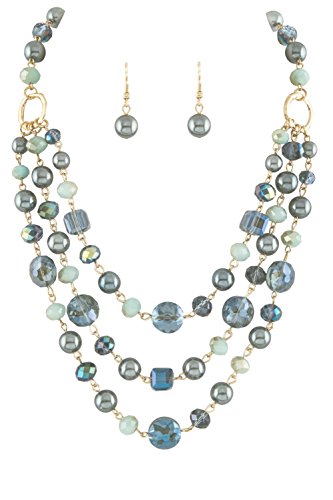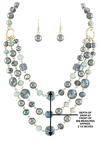 18 inch blue-gray imitation-pearl finish, transparent blue and blue/gray ombre effect acrylic bead 3 line layered bib necklace with gold-tone findings.