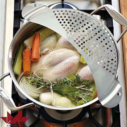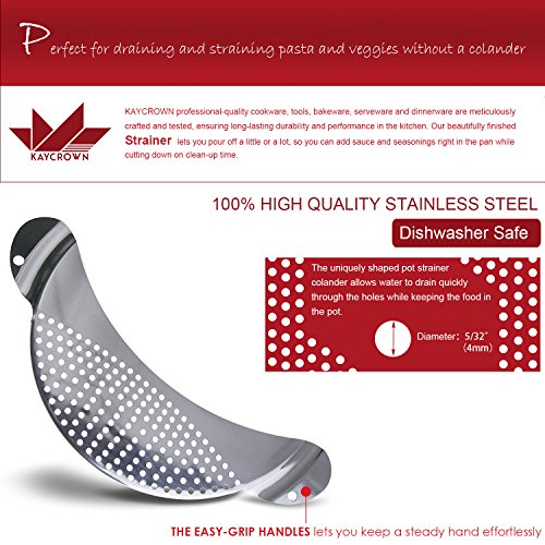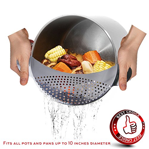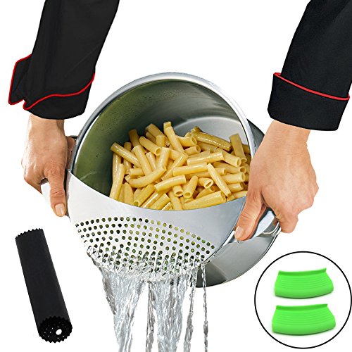 ✅ Life in the kitchen is easier when you use the right tool for the task. We've custom-designed this stainless steel Pan Pot Strainer, easy draining of pastas, veggies, spaghetti and more without the hassle of pulling out a bulky colander.Bonus FREE silicone garlic peeler and 2 pack hot handle holders.