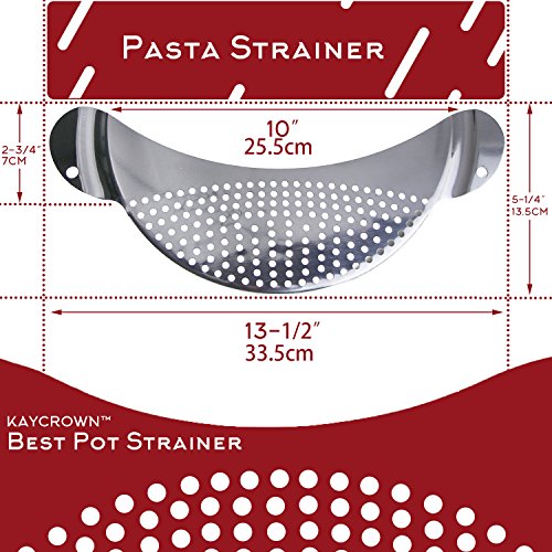✅ EASE OF USE: Unique design pasta strainer pot strainer with two large recessed grips on either side keeps hands away from hot water. Closed spaced holes ensure rapid, efficient draining. Suitable for all pot SIZES up to 10 inch diameter.