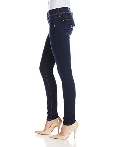 - Feature : Dark-rinse denim skinnies featuring contrast stitching and wide waistband with double button and zip fly / Light whiskering at hips / Pointed button flaps at back pocket