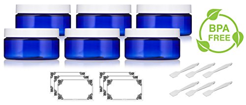 Cobalt Blue PET Plastic (BPA Free) Refillable Low Profile Jar with White Lid - 8 oz (6 pack) + Spatulas and Labels