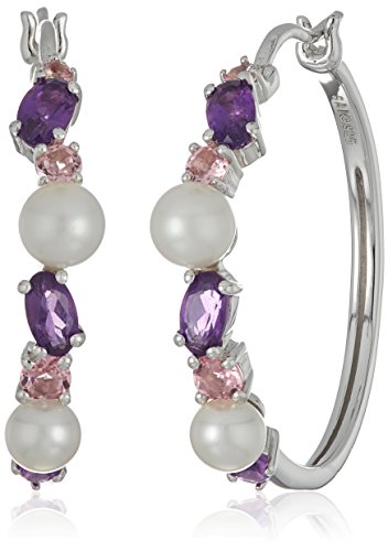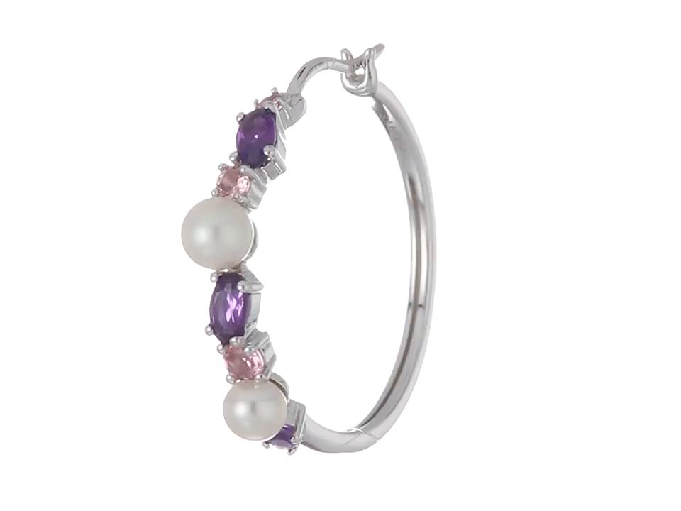 Sterling Silver Pearl, Pink Tourmaline and Amethyst Hoop Earrings