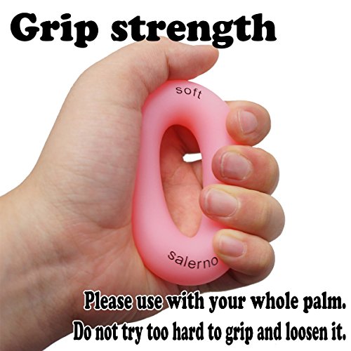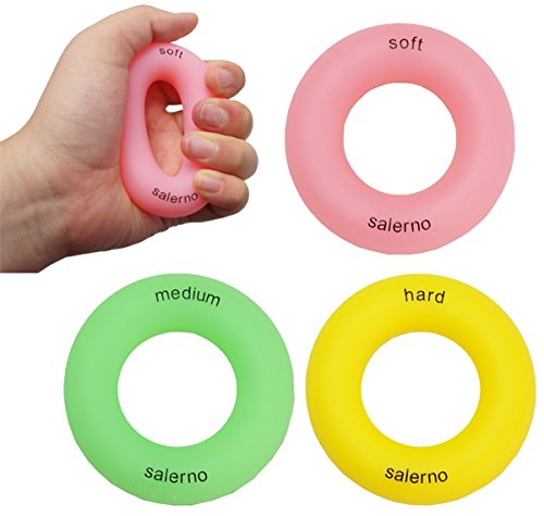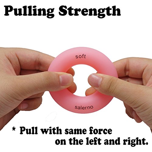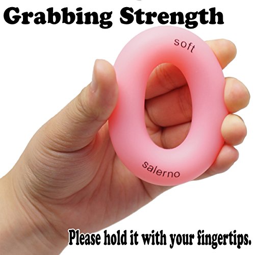 Studio : iMarks Publisher : iMarks Binding : Misc. Product Description ?RELIEVE daily stress and strengthen your hands even while watching TV, at the office or in the bath. ? ? ?No noise when you press the Ring Hand Gripper.? ? ?3 RESISTANCE LEVEL Avaiable. Light LEVEL, color coded pink, ideal for starters or rehab.? Medium level, color coded green, ideal for maintenance of already strong hands and Hard level, color coded blue, for extreme training and conditioning of extensors.? ? ?Material: Silicon When it get dirty you can keep a clean by washing with a mild detergent. It uses medical silicone, so there is almost no rubber smell.?? ? ?Package includes 1 Light Level, 1 Medium Level and 1 Hard Level finger strengthener.? Size: outer diameter 3.0" (7 cm), inner diameter 1.4"(3.5 cm)??Weight: around45g?