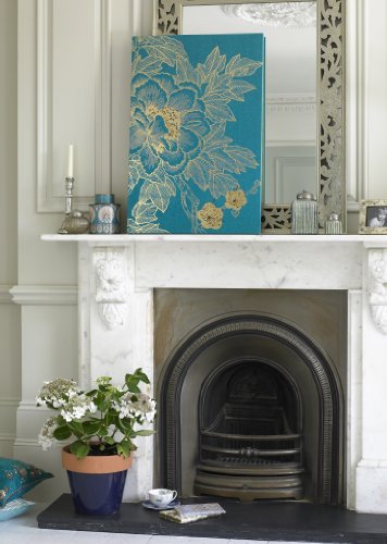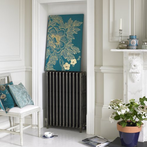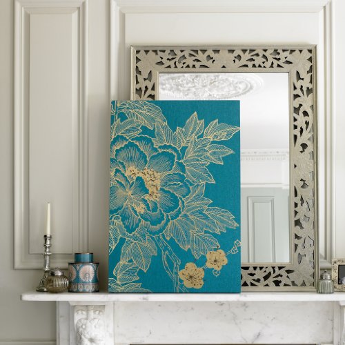Lhasa Lotus in Teal is a beautiful ornate design created from gold metallic printing and strategically embellished with gold sequins. The teal colored linen canvas gives a sophisticated contrast. Looks great hung vertically or horizontally.Feature