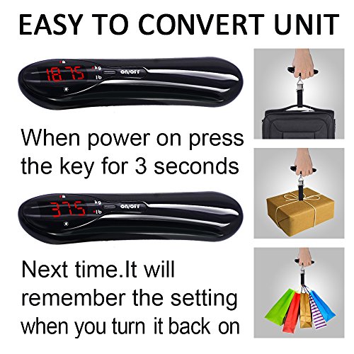 Using Notice: 1. Install batteries: Put 2pcs aaa batteries into the scale 2. Power on: Please grip the scale and make the hook/strap upright in natural state,press the key to power on. 3. Unit convert: when power on,press the key for 3 seconds,and the red indicator will change between kg and lb.If you set it to lb and then turn it off, it will remember the setting when you turn it back on. 4. Auto-tare function: When you need container to weight,for example:use container to weight a fish,hang the container before powering on the scale,then power on, the weight will display "zero",put the fish to the container, the weight you seen is the fish weight