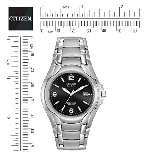Classic styling at its' best. From the smooth, titanium case and bracelet to the date indicator, this Eco-Drive timepiece is the perfect everyday watch. Additional features include a date indicator, three-hand function, water resistant to 100 meters and fold over clasp with push button.
