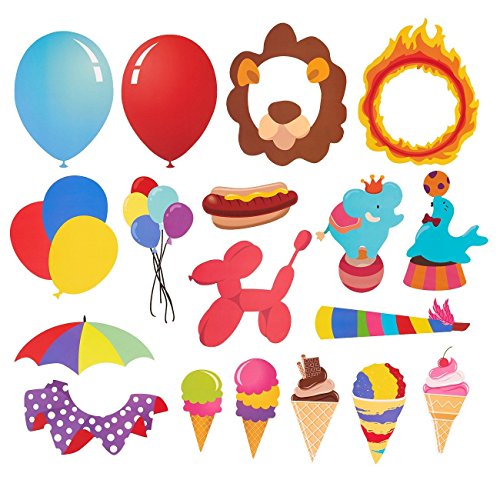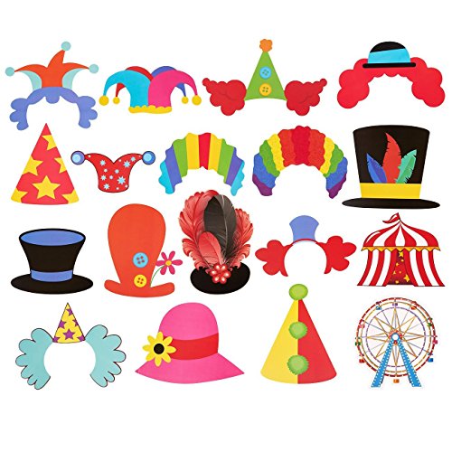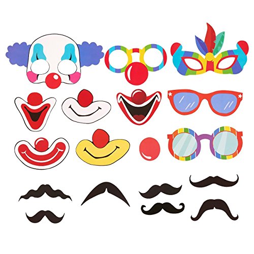 -. Feature : CIRCUS CLOWN PHOTO BOOTH PROPS: This set contains 72 Circus-themed party photo booth props for selfies, party games and all kinds of fun! / GET THE PARTY STARTED: Perfect for any upcoming carnival events, clown parties, or circus or vaudeville-themed nights / IDEAL PHOTO COMPANIONS: These props are ideal as novelty photo booth decorations for use with friends for your social media profile, personal scrapbook or photos for nostalgia in years to come / SIMPLE DIY ASSEMBLY: Attach included dowel stick to photo booth props with included clear stickers. Add glue (not included) to reinforce hold / DIMENSIONS: From smallest to largest: 3.2 x 1 Inches (mustache); 6.6 x 8 Inches (high foot cap)