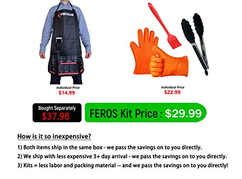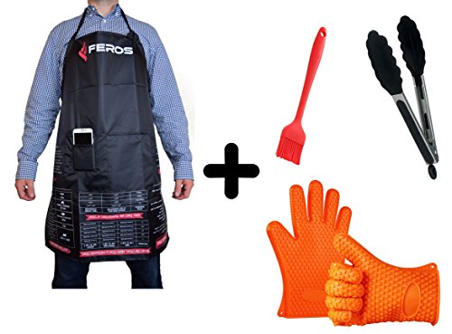 FEROS KIT - (5 Items!) FEROS Cheat Sheet BBQ Apron + Silicone Grill Tool Accessory Set (2 Silicone Gloves, Tongs, Baster Brush)