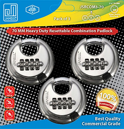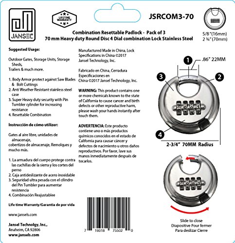 - Jansel Round Disc combination Resettable 4 Dials padlock has an exterior constructed out of rust resistant stainless steel - perfect for outdoor applications in need of reliable protection