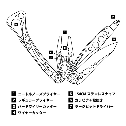 ●機能:ニードルノーズプライヤー、レギュラープライヤー、ワイヤーカッター、ハードワイヤーカッター、154CM直刃ナイフ、ラージビットドライバー、カラビナ(栓抜き兼用)